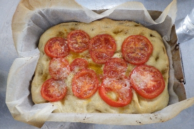 No dia seguinte, você verá que obteve uma bela massa fofa e bem crescida. Pegue-a com as mãos umedecidas com água e espalhe na assadeira coberta com papel manteiga e pincelada com um fio de azeite de oliva extra virgem. Deixe crescer por mais uma hora coberta com um pano de prato. Após o tempo, faça furos na massa com as pontas dos dedos.
