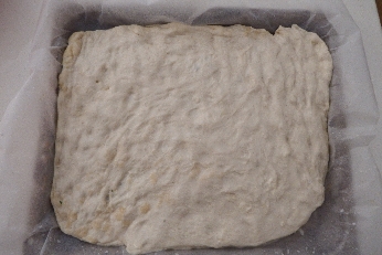 Divida a massa em duas partes iguais. Coloque a primeira parte na assadeira forrada com papel manteiga e untada com um fio de azeite de oliva extra virgem. Estenda-a com as mãos umedecidas com água e deixe crescer por mais uma hora coberta com um pano.