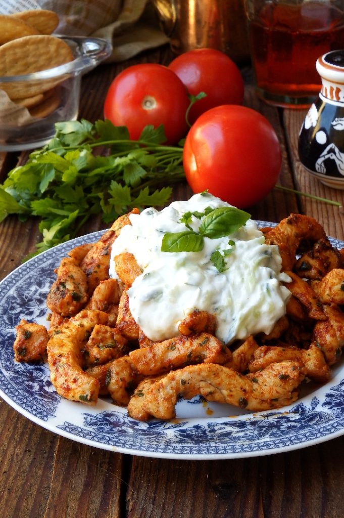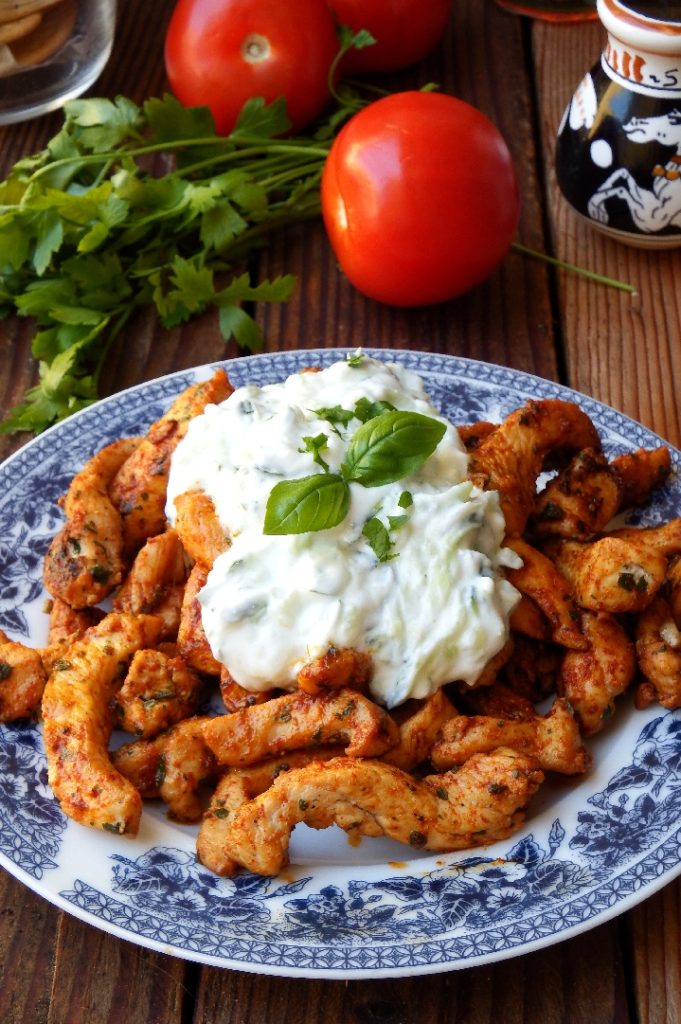 Coloque o frango grelhado na tigela, adicione a páprica doce e misture com a colher. Finalmente, coloque o frango no prato de servir, adicione o molho tzatziki no centro e leve à mesa. Bom apetite!