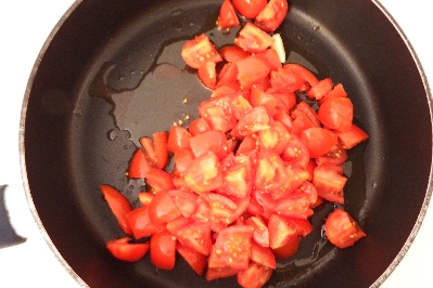 Em outra panela, coloque um fio de azeite, adicione os tomatinhos e o dente de alho. Cozinhe rapidamente em fogo alto por alguns minutos, os tomates devem permanecer bastante consistentes. Tempere com as folhas de manjericão, sal e uma pitada de pimenta vermelha em flocos