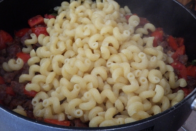 Coloque na panela. Acenda o fogo e comece a cozinhar a linguiça, deglace com o vinho branco, e com a ajuda de uma colher de pau, esmague até obter pequenos pedaços dourados. Desligue o fogo e reserve.