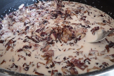 Despeje o leite na frigideira com o radicchio rosso, adicione a farinha, misture com a colher e continue cozinhando até que o molho fique cremoso. Ajuste o sal, a pimenta e um pouco de salsa fresca picada.