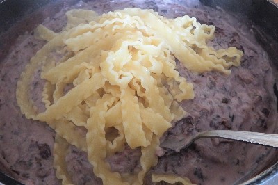 Retire a linguiça da pele e coloque em outra frigideira. Adicione o vinho branco, e com a ajuda de uma colher de pau, esmague até obter pedaços pequenos. Doure bem, desligue o fogo e reserve.