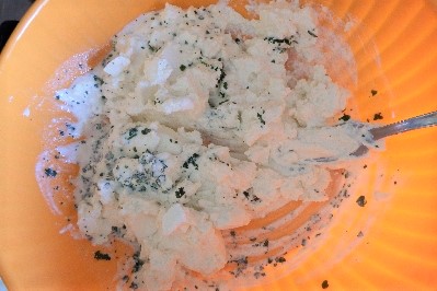 • Em uma tigela coloque a ricota peneirada com o dente de alho descascado e picado e as folhas de manjericão picadas, ajuste com sal e pimenta.