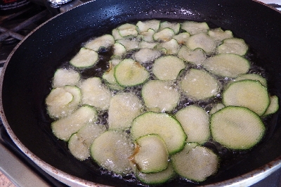 • Aqueça na frigideira dois dedos de óleo de amendoim, quando atingir a temperatura mergulhe as abobrinhas e cozinhe até que fiquem douradas e crocantes. Retire com a escumadeira e coloque no prato forrado com papel absorvente