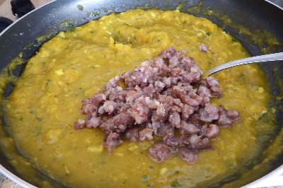 Retire a linguiça da tripa e coloque em outra frigideira. Regue com o vinho branco, e com a ajuda de uma colher de pau, esfarele até obter pequenos pedaços. Doure bem, apague o fogo e reserve.