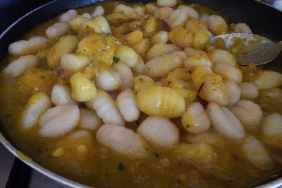 Cozinhe os nhoques em uma panela com água fervente salgada. Escorra-os com uma escumadeira quando vierem à superfície e coloque na frigideira com o molho de abóbora e linguiça. Refogue em fogo alto até que os nhoques estejam bem envolvidos no molho. Sirva imediatamente e bom apetite!