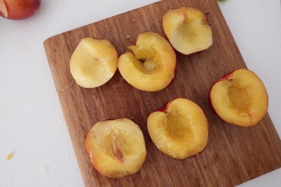 Derreta a manteiga em banho-maria e pincele a polpa dos pêssegos