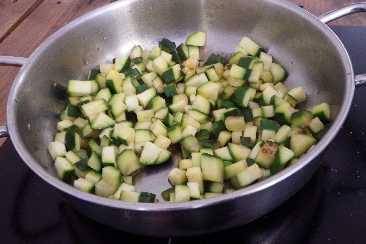 Corte as abobrinhas em cubos e coloque na frigideira com um fio de azeite e o dente de alho com casca. Cozinhe até que a água da vegetação evapore completamente. No final do cozimento, retire o alho e tempere com sal e pimenta