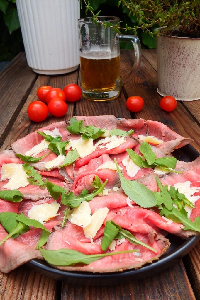 Agora que o rosbife está frio, corte em fatias finas, coloque no prato de servir, tempere com uma pitada de sal, pimenta e um fio de azeite de oliva extra virgem. Decore com rúcula e lascas de grana. Bom apetite