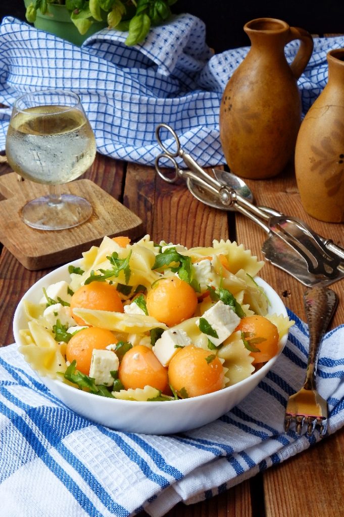 A salada de macarrão com melão, rúcula e feta é um prato principal de verão que se diferencia um pouco das habituais massas frias, e que combina maravilhosamente a doçura do melão com o sabor marcante da feta e da rúcula.