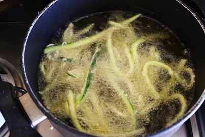 • Passado o tempo, despeje o óleo na panela e atinja a temperatura de 170°. Para saber qual é a temperatura ideal, mergulhe um palito no óleo e quando você ver que se formaram bolhas ao redor, significa que está pronto para cozinhar. Frite os legumes aos poucos até que fiquem dourados e crocantes. Retire-os com uma escumadeira e coloque no prato forrado com papel absorvente. Sirva imediatamente e bom apetite!
