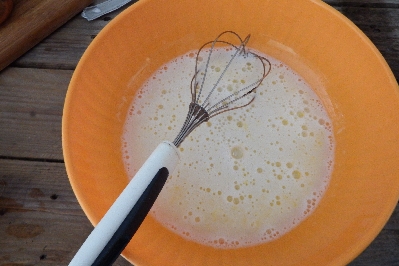 • Despeje as gemas na tigela com uma pitada de sal e trabalhe com os batedores. Em seguida, adicione a água com gás gelada e aos poucos a farinha, continuando a trabalhar com os batedores, até obter uma massa lisa e sem grumos