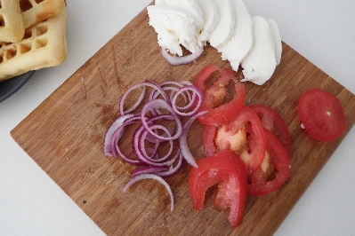 Corte a cebola, tomates e mozzarella em fatias.