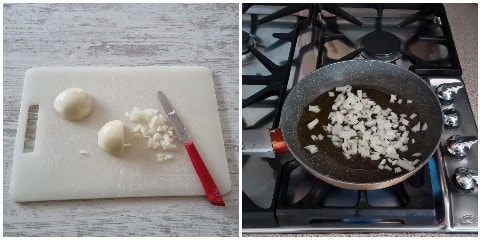 Descasque a cebola e pique grosseiramente, depois refogue com um fio de azeite por alguns minutos.