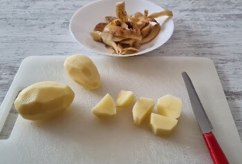 • Enquanto isso, descasque as batatas, enxágue e corte em cubos (NÃO muito pequenos).