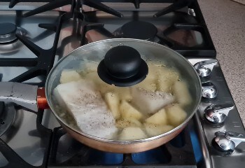 • Acrescente os pedaços de bacalhau e algumas pitadas de pimenta, recoloque a tampa e cozinhe em fogo baixo por 20-25 minutos. De vez em quando, vire as batatas delicadamente e despeje um pouco do caldo de cozimento sobre o bacalhau. Se necessário, durante o cozimento, você pode adicionar uma concha de água quente.