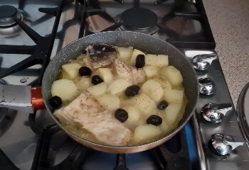 • Após o tempo necessário, adicione as azeitonas e continue cozinhando por mais 5-10 minutos (antes de retirar do fogo, certifique-se de que o bacalhau e as batatas estejam cozidos corretamente).