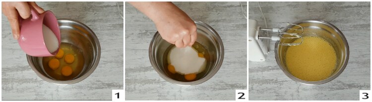 Quebre os ovos e coloque-os em uma tigela; adicione o açúcar (1) e uma pitada de sal (2), depois bata por alguns minutos com o batedor elétrico (3).