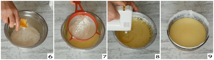 Em outra tigela, misture a farinha, o amido e o fermento (6), depois peneire-os e adicione-os à massa pouco a pouco (7), continuando a bater com a batedeira (8).