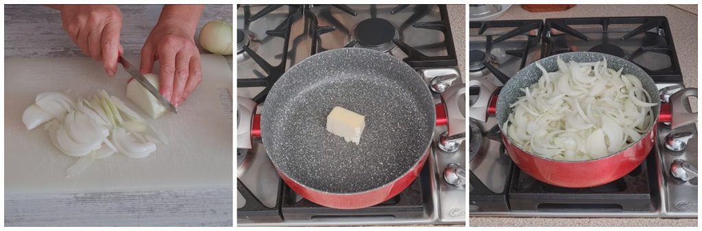 • Deixe cozinhar em fogo baixo até que as cebolas fiquem macias (levará cerca de 25-30 minutos). Mexa de vez em quando e, se as cebolas secarem muito durante o cozimento, você pode adicionar algumas colheres de água quente.