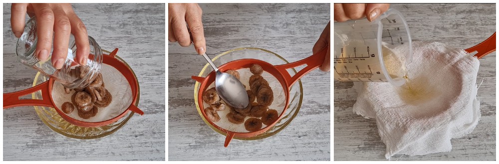 Coe o álcool aromatizado com banana, deixando-o cair em uma tigela, depois coe novamente passando pelo coador forrado com uma gaze.