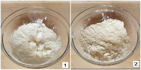 Coloque a farinha em uma tigela (eu a misturo um pouco com um batedor em vez de peneirá-la), adicione a banha (1) e trabalhe esfregando a palma das mãos com a farinha e a banha até completa absorção (2).