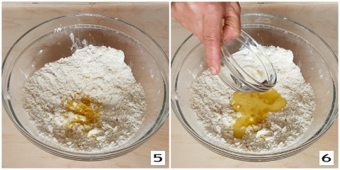 Faça uma cova no centro e adicione uma pitada de sal, as raspas de limão raladas (5), o ovo levemente batido e a água (6).