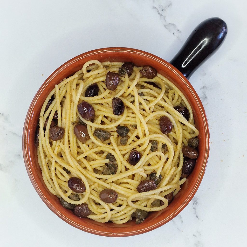 Um primeiro prato muito simples de preparar com pouquíssimos ingredientes, mas que é capaz de proporcionar grande sabor à preparação: alho, azeite, azeitonas, alcaparras, farinha de rosca e uma pitada de pecorino ralado.