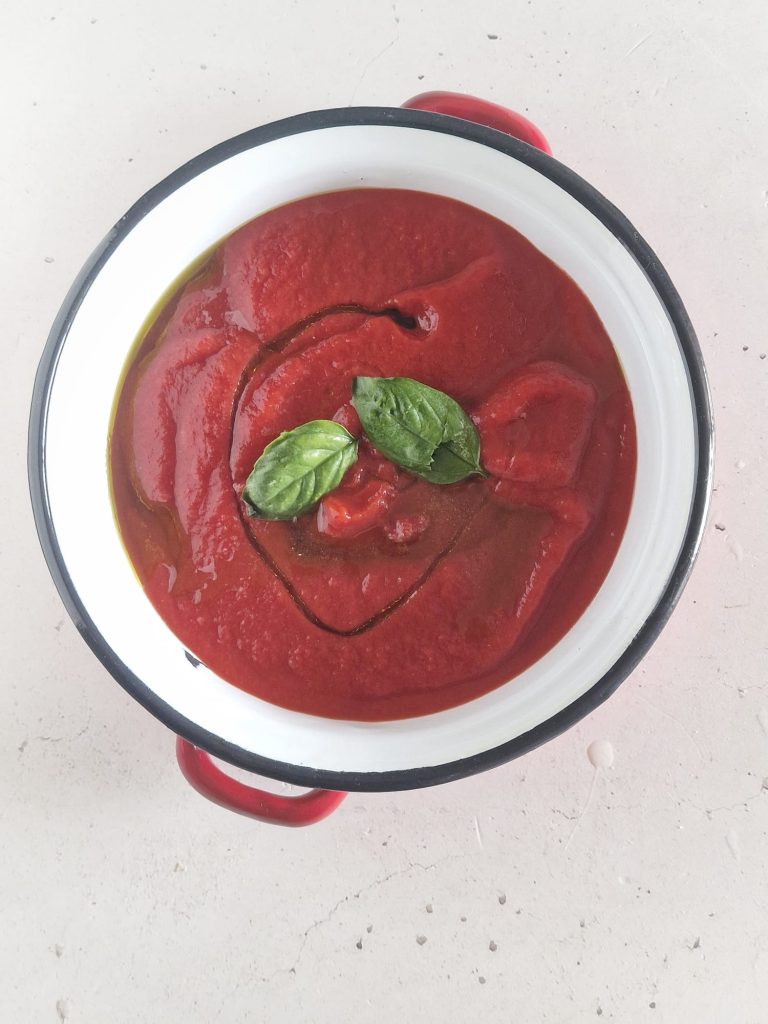 Em uma caçarola, aqueça um fundo de azeite de oliva extravirgem e depois adicione a passata de tomate, salgue e perfume com algumas folhas de manjericão.