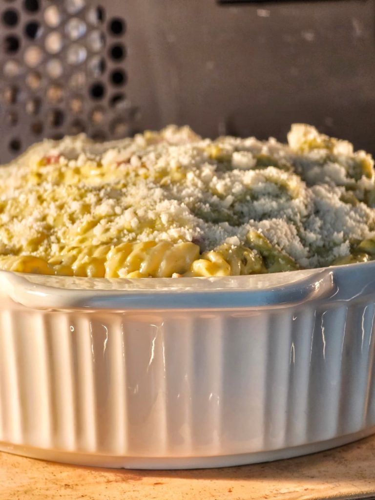 A massa ao pesto no forno se conserva na geladeira por alguns dias, dentro de um recipiente hermético. Você pode aquecê-la novamente no forno, no micro-ondas ou na frigideira com uma pequena noz de manteiga.