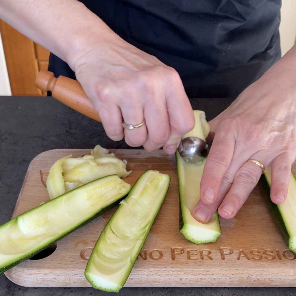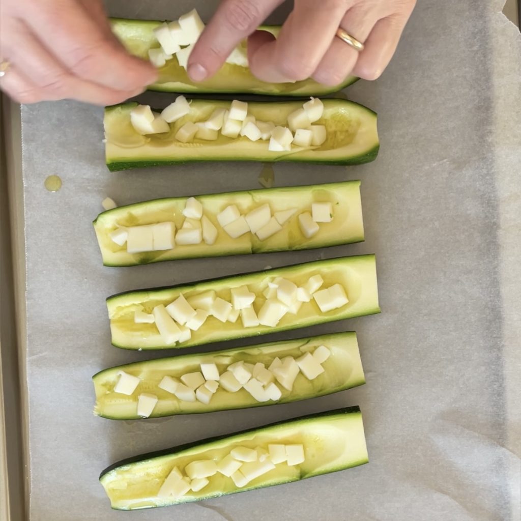 • Vamos começar a preparar as Abobrinhas com tomate-cereja e queijo, lave as abobrinhas, corte as pontas e corte-as ao meio no sentido do comprimento, usando um boleador ou uma faca, esvazie as abobrinhas e coloque-as em uma assadeira forrada com papel manteiga.