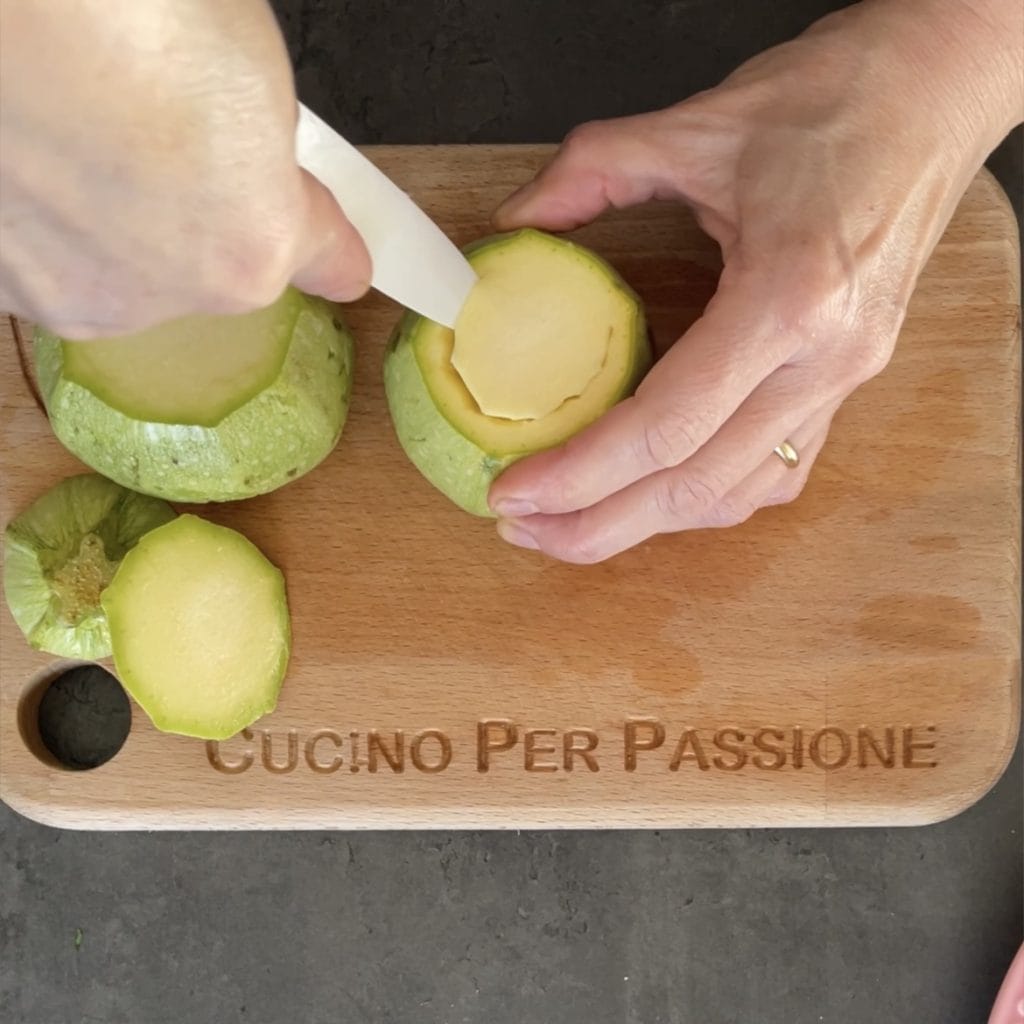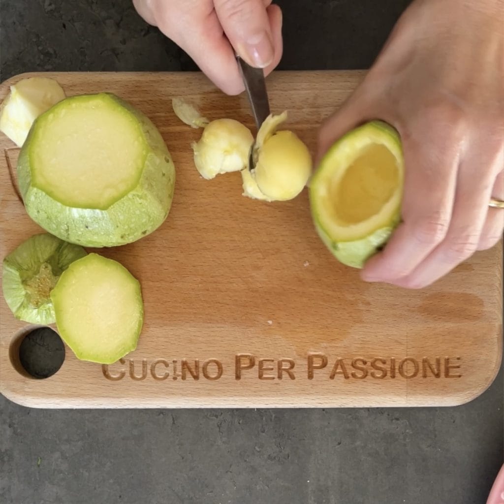 • Lave as abobrinhas, corte a parte superior e reserve, com uma faca faça um corte na polpa.