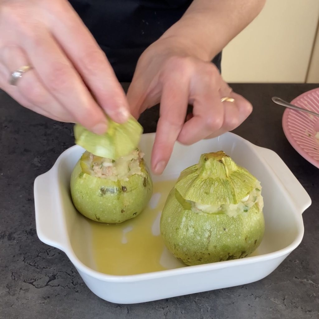 • E cubra com a parte superior da abobrinha. Asse em forno estático pré-aquecido a 180°C por 20 minutos, a abobrinha deve estar cozida, mas ainda crocante.