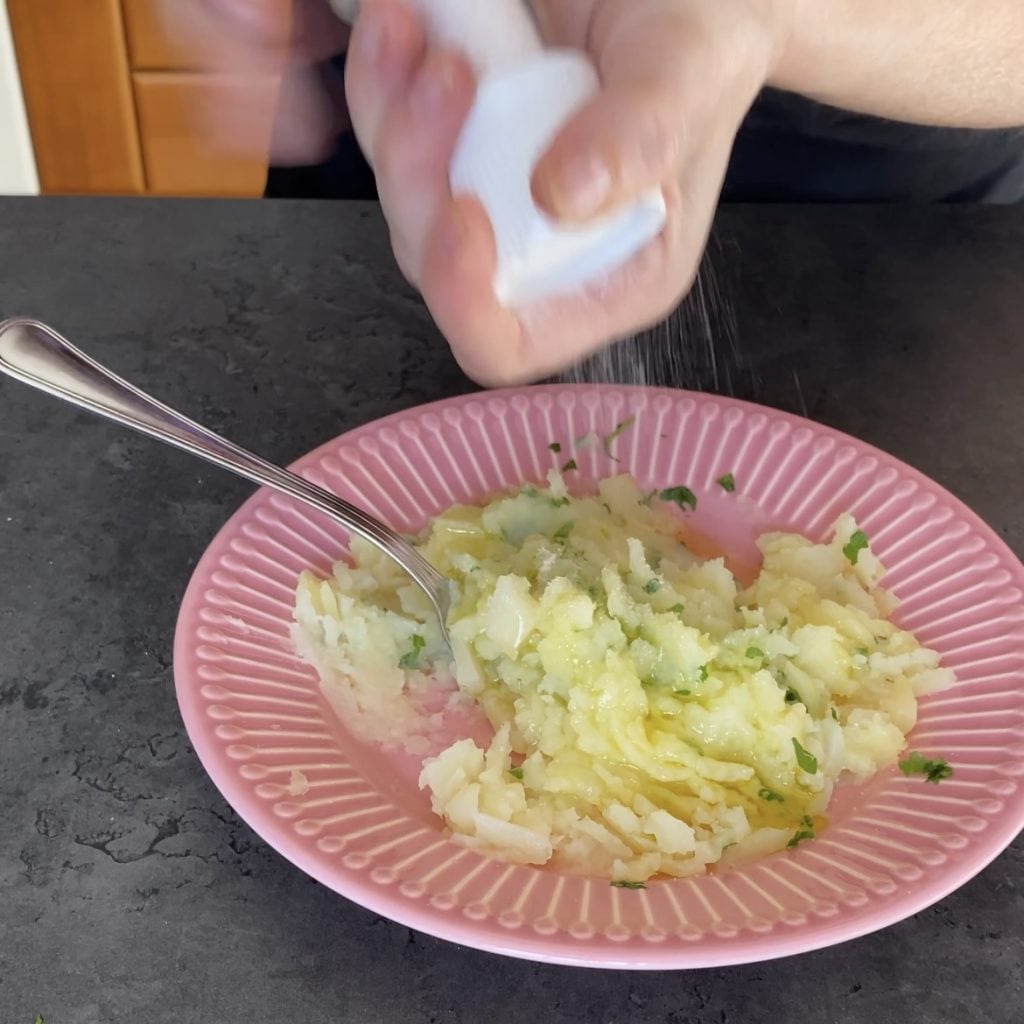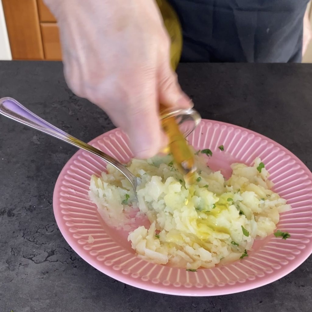 • Cozinhe as batatas, corte-as em pedaços, coloque em um prato e adicione salsinha picada.