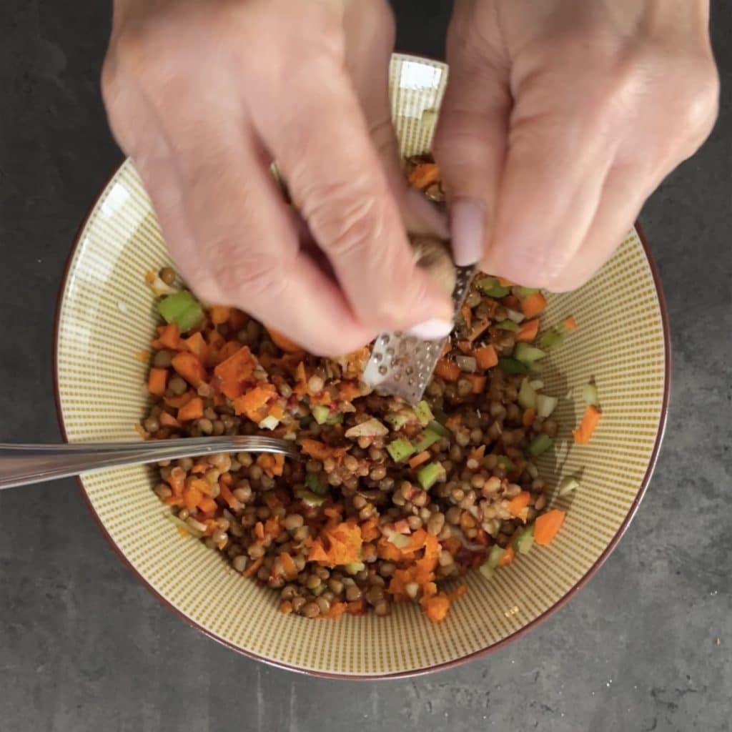 Coloque em uma tigela as lentilhas cozidas e a cenoura cozida e amassada,