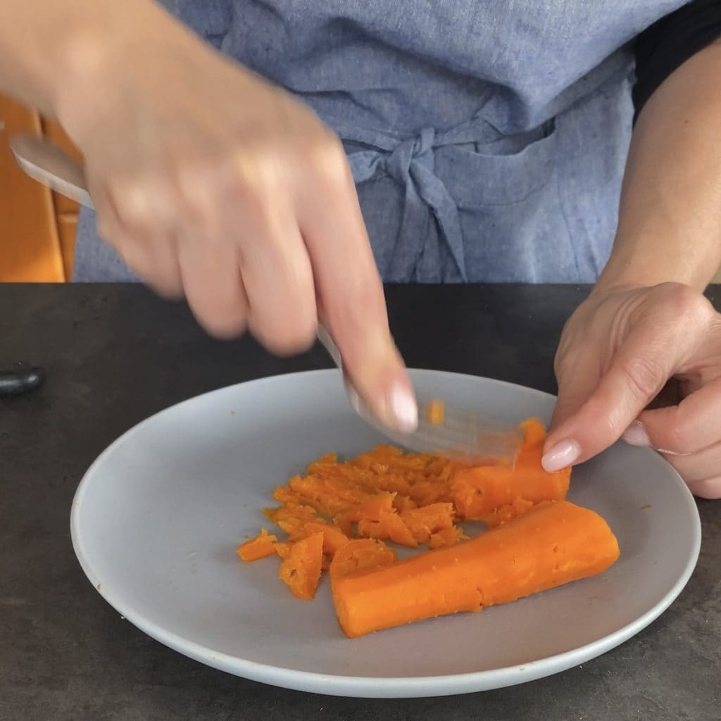 Quando a cenoura estiver cozida, escorra-a e amasse-a com um garfo.