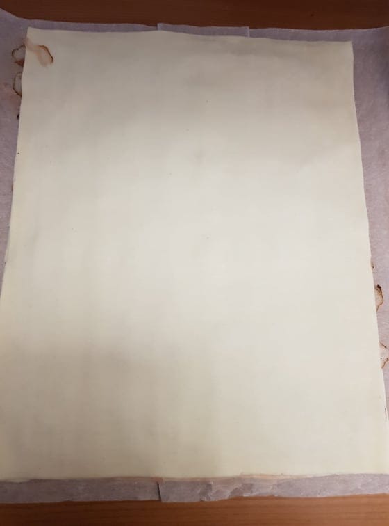 • Começamos a preparar a Árvore de natal com massa folhada e speck, desenrole a massa folhada e coloque-a em uma superfície, arrume também todas as fatias de speck em uma das massas, como você vê na foto.