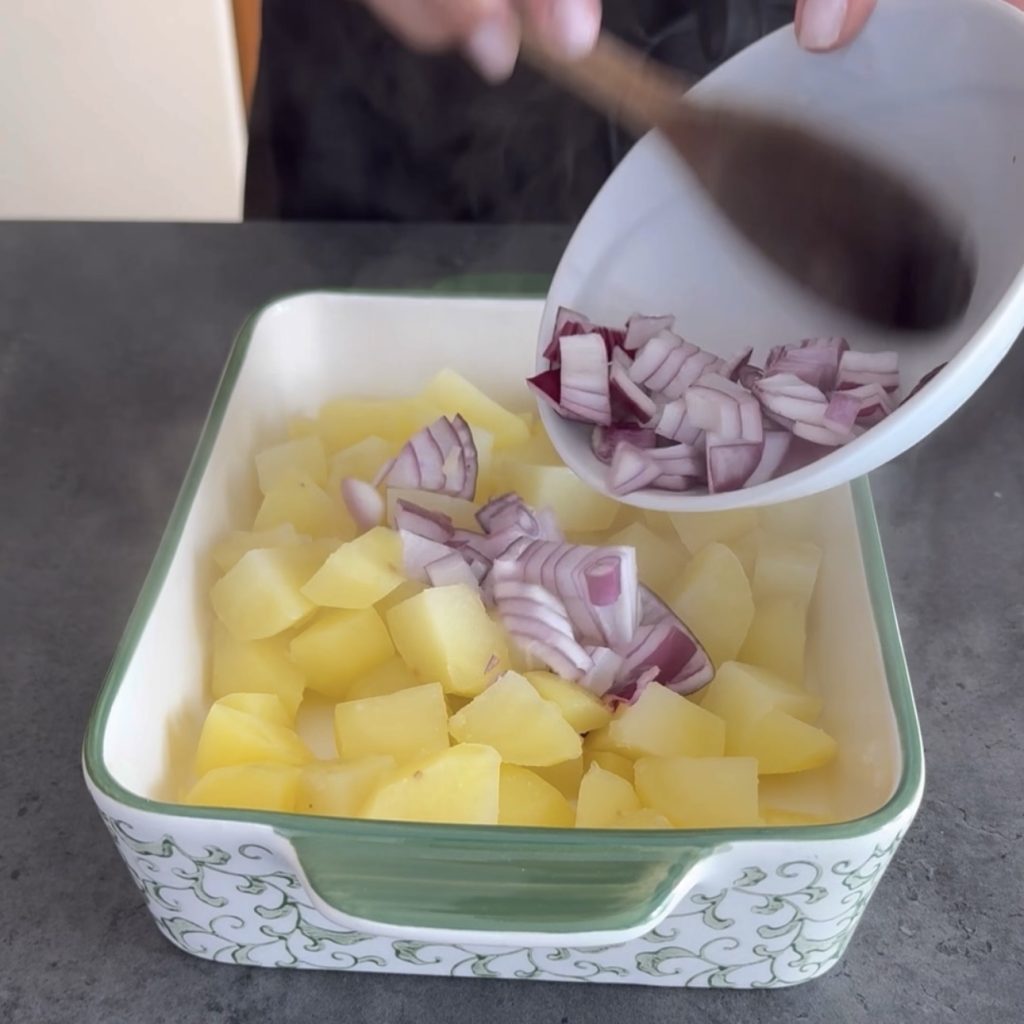 Sirva as Batatas e speck assados com cebola bem quentes