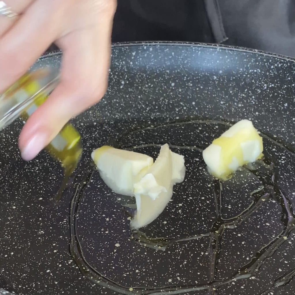 Despeje manteiga e azeite de oliva extravirgem em uma frigideira e quando a manteiga estiver derretida