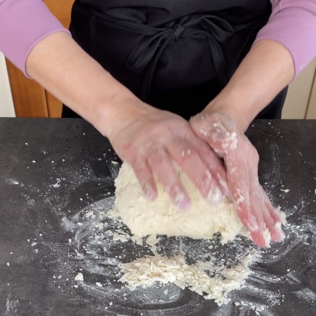 depois adicione o restante da farinha e misture com as mãos até obter uma massa compacta,