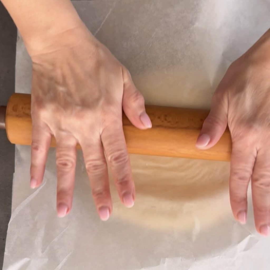Transfira a massa para entre duas folhas de papel manteiga e abra-a com um rolo até ficar fina, coloque-a na geladeira para descansar por pelo menos 30 minutos.