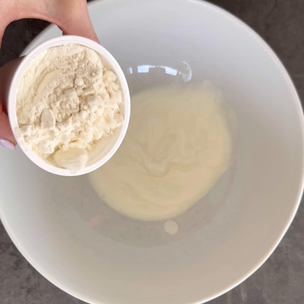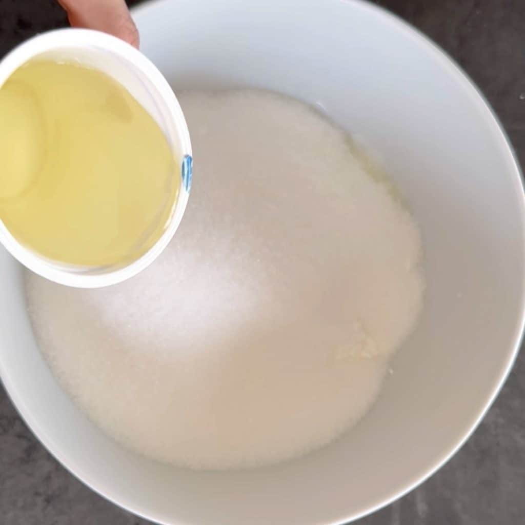 • Começamos a preparar o bolo 7 potes, coloque em uma tigela um pote de iogurte, depois lave o pote com água e seque-o.