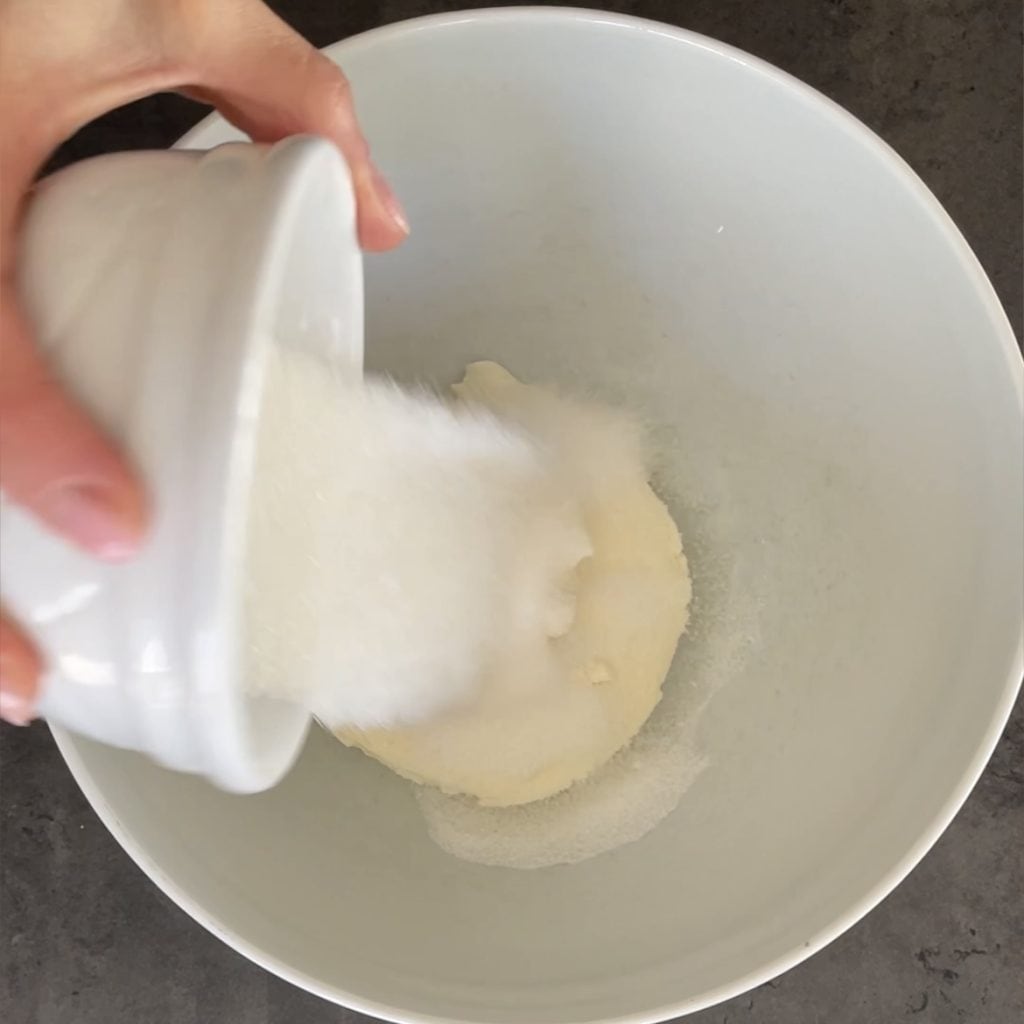 Começamos a preparar o bolo com cerejas em calda e iogurte, coloque o mascarpone na tigela,