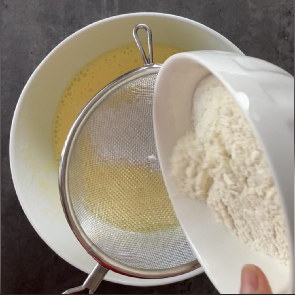 Peneire o fermento em pó para bolos.