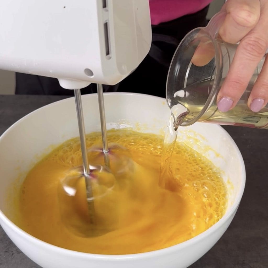 em seguida, adicione o óleo de girassol aos poucos, sempre com a batedeira em ação.