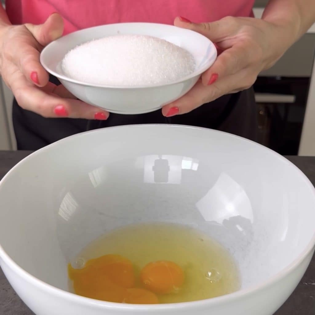 Começamos a preparar o bolo de menta e coco, coloque na tigela os ovos e o açúcar,