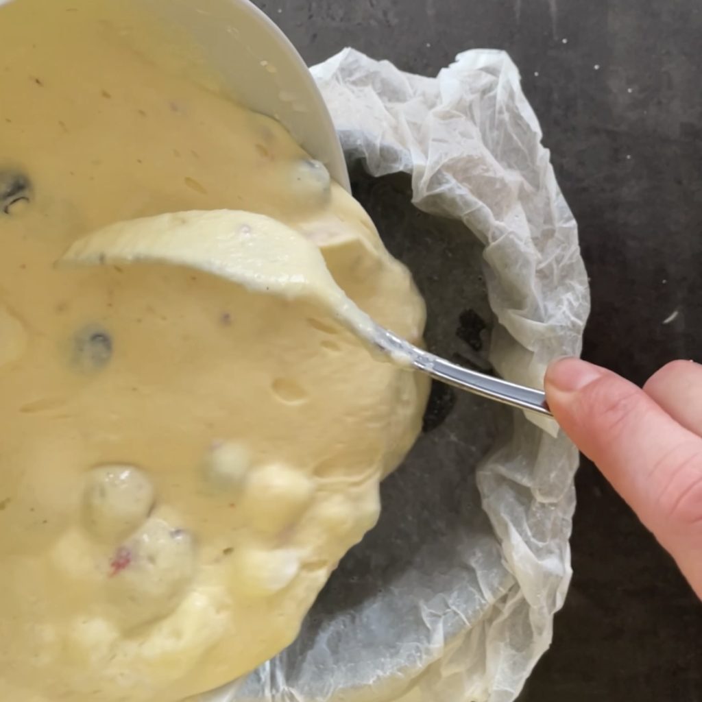 Passe as frutas vermelhas em um prato com maisena e, em seguida, adicione à forma. Este passo assegurará que as frutas recém-adicionadas não afundem na mistura, mas permaneçam na superfície.