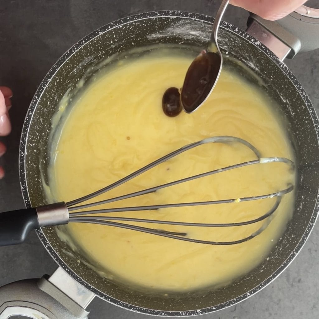 • Retire a panela do fogo, adicione uma colher de chá de essência de baunilha