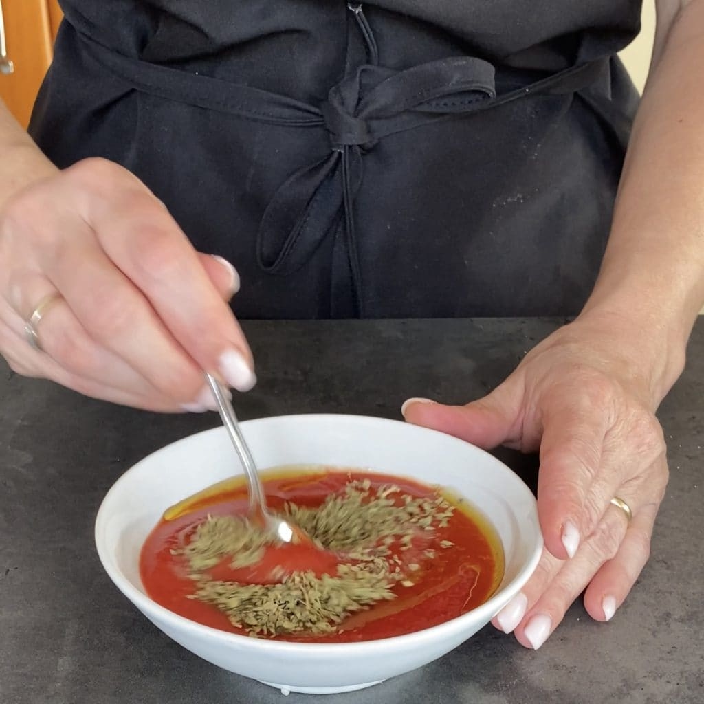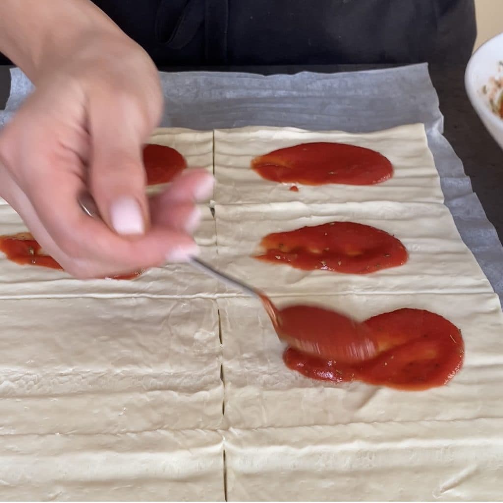 Começamos a preparar os Canoli de pizza despejando o molho de tomate em uma tigela, adicione uma pitada de sal,